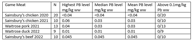As this table shows, the measures of lead (Pb) levels in non-game meat are very low, and critically, there are no samples that breach the maximum legal level – which is 0.1mg of lead per kg of wet meat.