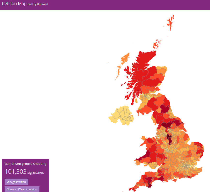 Our Ban Driven Grouse Shooting petition has passed the milestone of 100,000 signatures and is now standing at over 101,000 signatures. 100,000 signatures is the level that normally triggers a parliamentary debate on a subject.