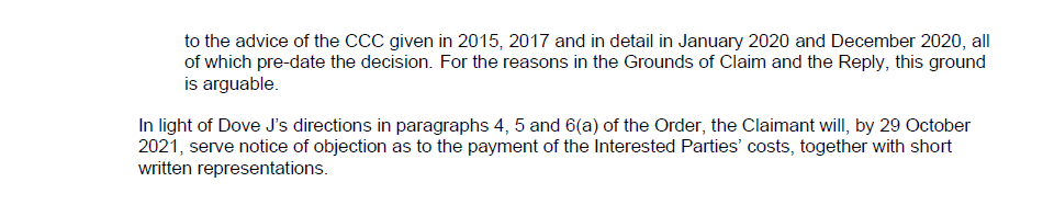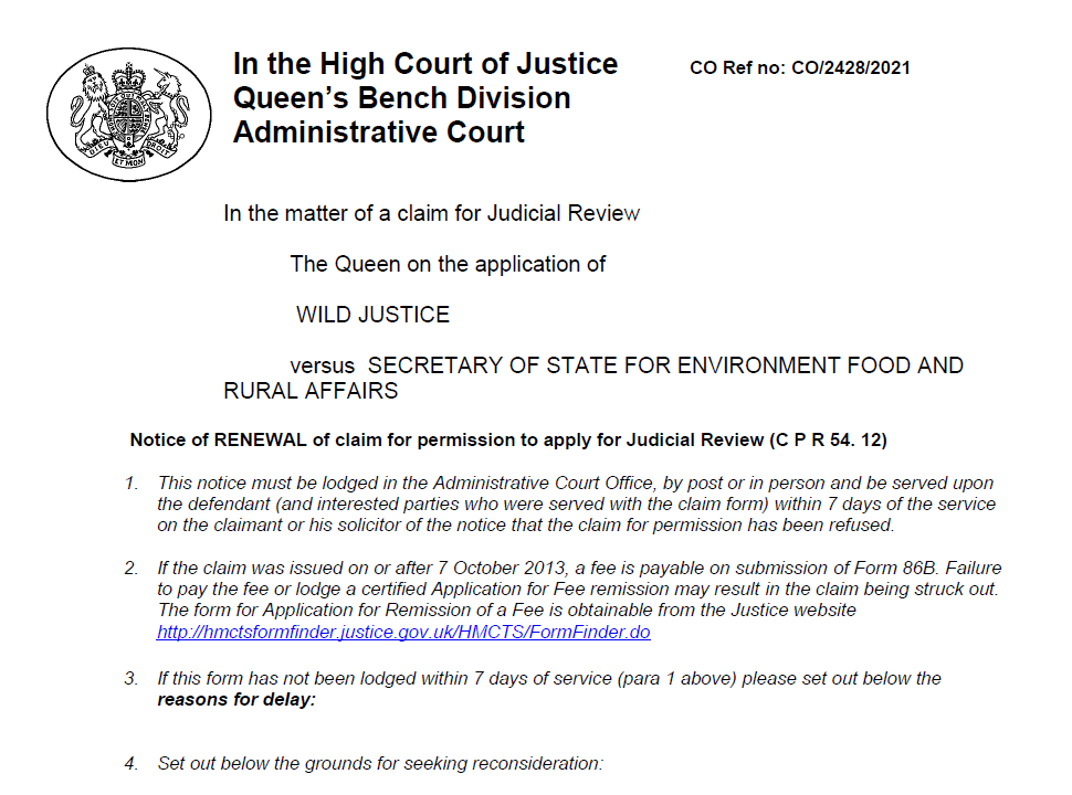 At the foot of the renewal is the short phrase ‘…the claimant will, by 29 October 2021, serve notice of objection as to the Interested parties’ costs‘. We are not arguing that we should pay lower costs, we are quite happy to pay the £10k that the process demands under the Aarhus Convention for an environmental case. In such cases, costs are capped, it’s a very sensible system to allow proper challenge of the decisions of statutory bodies where the claimant is acting for the public good and will make no personal gain from the case. We are objecting because we think that the Interested Parties (BASC, Countryside Alliance, National Gamekeepers’ Organisation and the Moorland Association) 1) added nothing to the legal argument 2) want to give the money away anyway and 3) we would much rather the taxpayer were reimbursed when we lose. Basically, the Interested Parties butted in and are now collaring some of DEFRA’s cost entitlement (in our view).