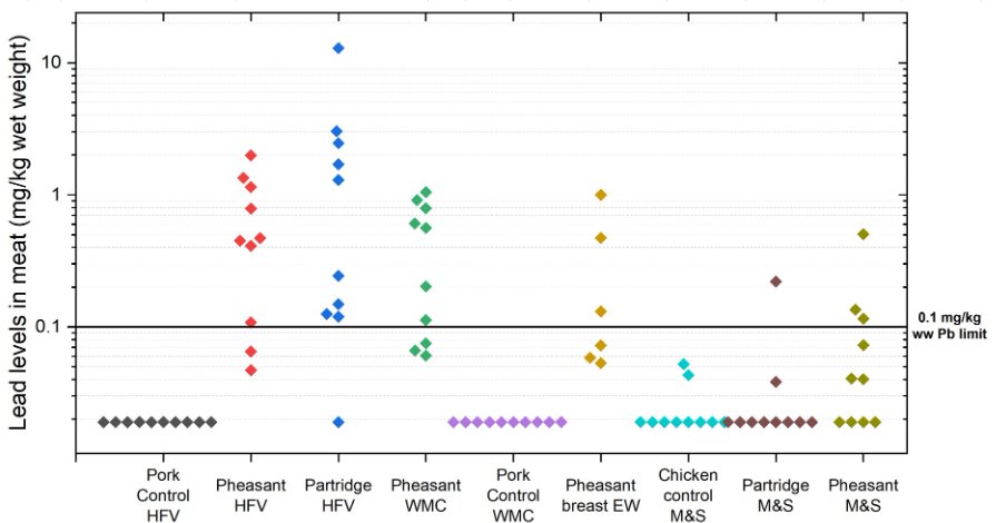 Both the Pheasants (8/10) and partridges (9/10) contained high levels of lead, above the legal maximum for lead in non-game meat. The median lead level for the 10 Pheasant samples was 0.46 mg/kg ww Pb, 4.6 times the maximum for lead in non-game meat, and the highest level was 1.99 mg/kg ww Pb, just under 20 times the maximum for lead in non-game meat, For the 10 partridges the median lead level was 0.76 mg/kg ww Pb, 7.6 times the maximum for lead in non-game meat, and the highest level was 12.92 mg/kg ww Pb, over 129 times the maximum for lead in non-game meat,