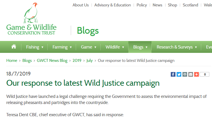 GWCT is clearly rattled by the Wild Justice legal challenge – even though it is to Defra. Rarely do we hear the thoughts of GWCT Chief Exec Teresa Dent; we only usually get the spin of her right hand man, Mr Gilruth. So it must be something momentous to get Teresa to utter.
