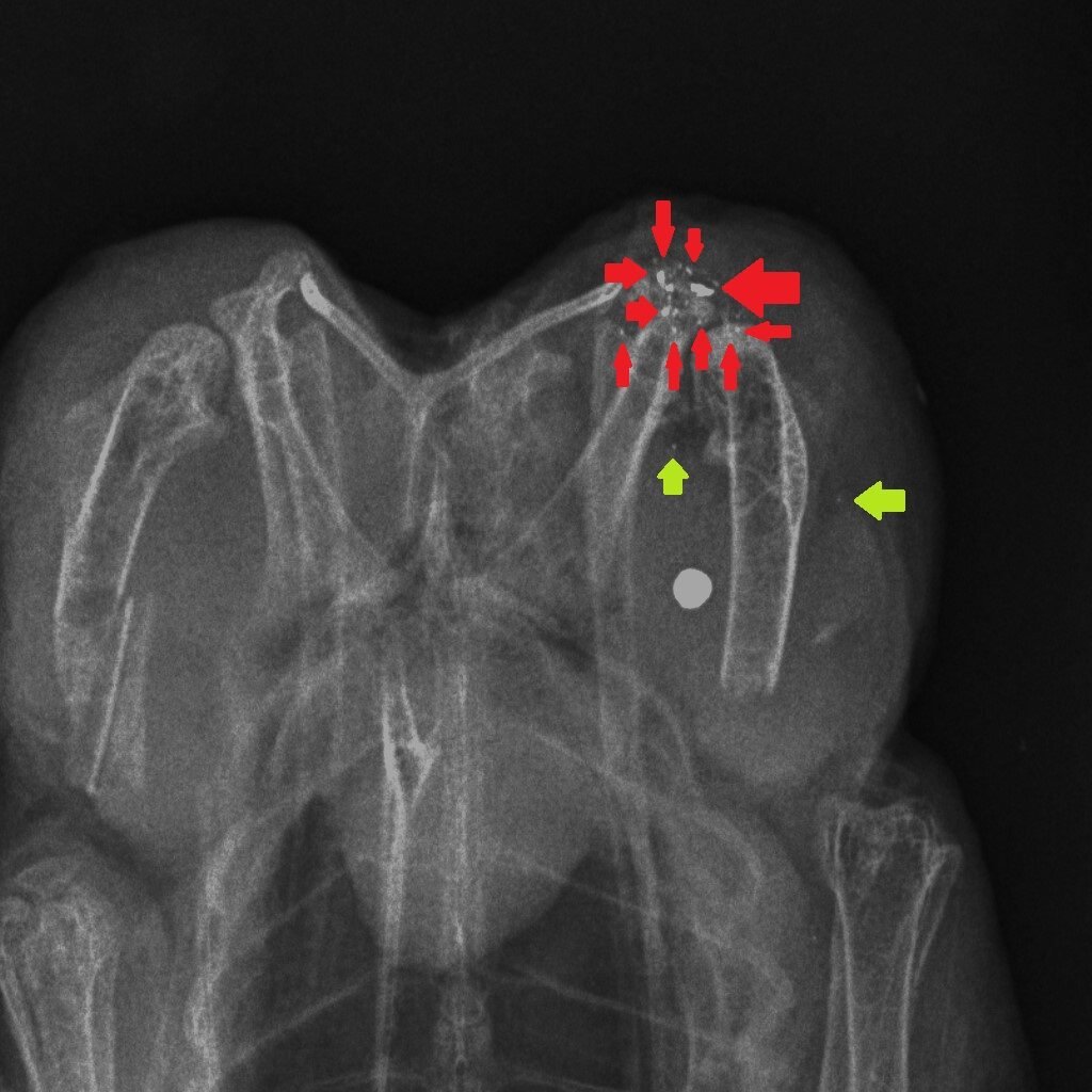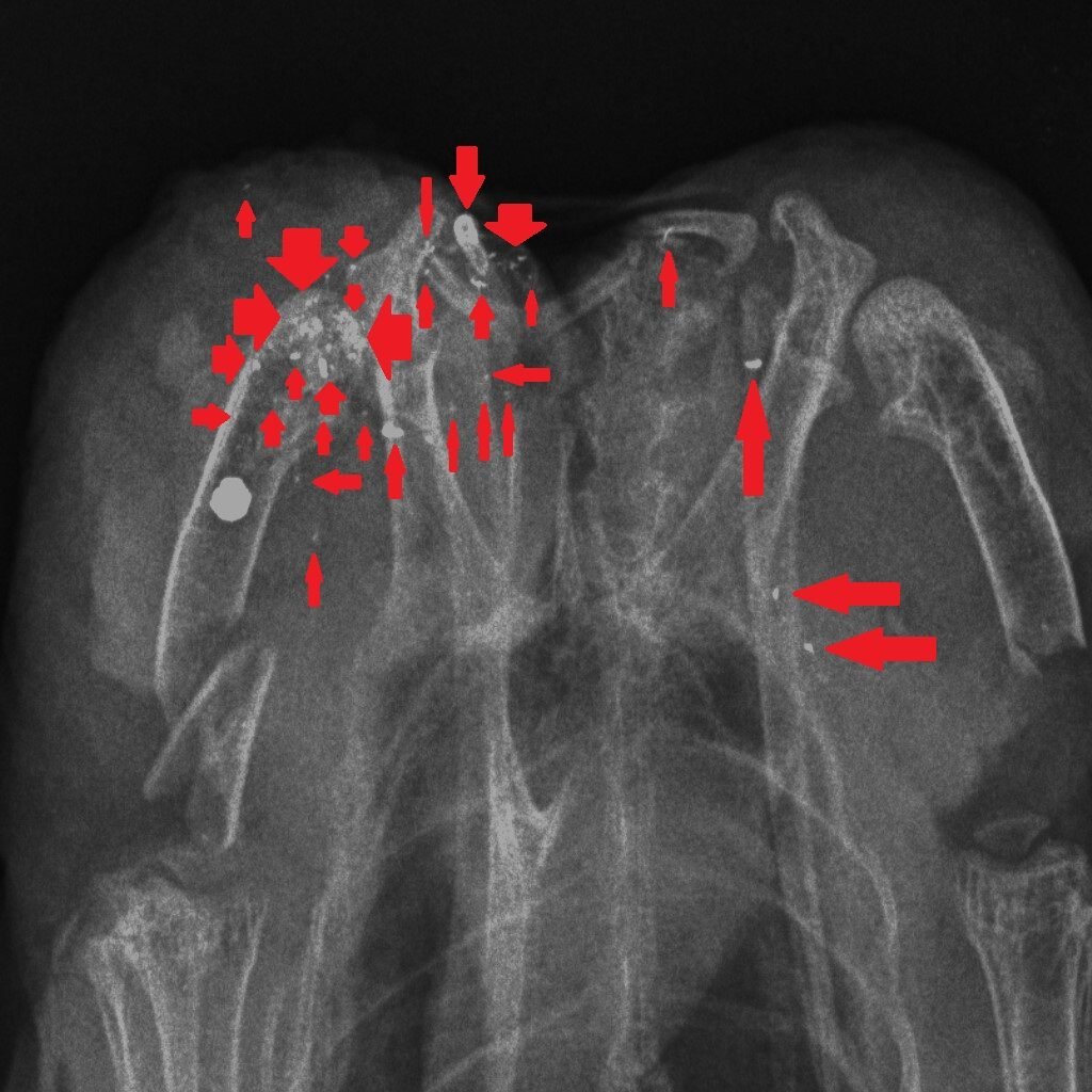 How could we reduce the risk of exposure to lead in game meat? It’s simple – stop shooting lead ammunition into animals that are destined for the human food chain. One of the useful properties of lead is that it is soft and malleable – that’s why, in the past, we have used it widely. But those same physical properties mean that lead passing through the flesh of a shot animal, hitting organs, soft tissue, bones and cartilage, shatters and tiny fragments of lead spread through the body of the animal. Here are three x-rays of shot birds that were bought in butcher’s shops and then x-rayed. The top x-ray is of a partridge and the other two are Red Grouse. Large white circular objects are lead shot. The green arrows point to fragments of bone and the red arrows indicate fragments of lead, from the shot, that have spread through the flesh.