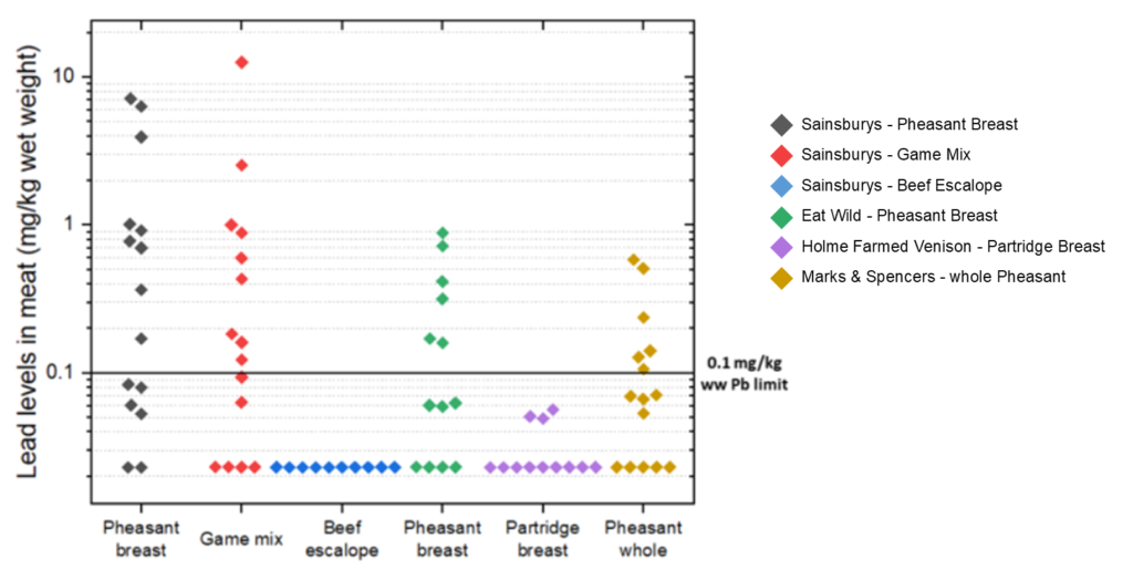 The horizontal line (at 0.1mg/kg Pb ww) shows the legal maximum lead level for non-game meat. There is no legal maximum lead level set for game meat – which is totally bizarre.