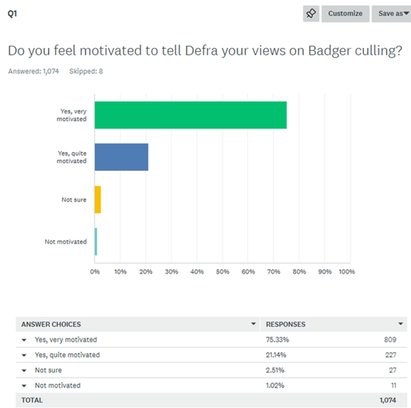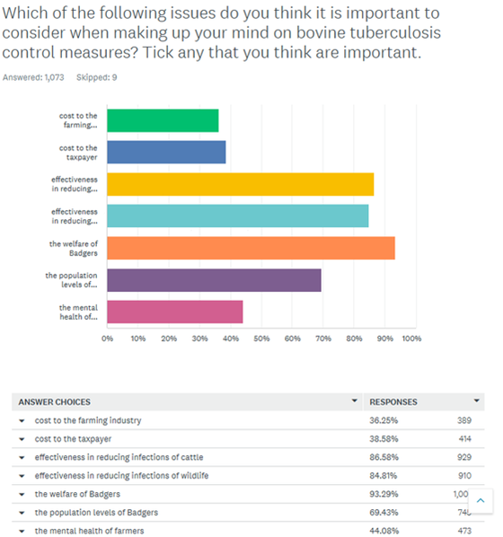 On Friday morning we asked you to spend about 20 minutes reviewing the current Defra Badger cull consultation. We are very grateful to 1082 of you who completed that task: 715 on Friday, 145 on Saturday, 108 on Sunday, 107 on Monday and 7 on Tuesday. Here are the summarised results which we will be making available to Defra later today. Defra has said that it will respond to the letter sent by Wild Justice and the Badger Trust criticising the consultation by Friday so this is further input to their cogitation.