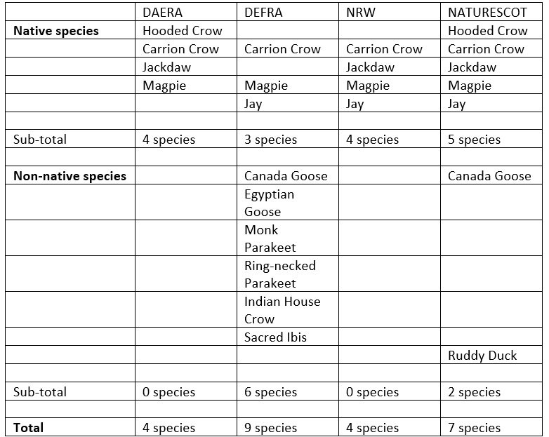 Northern Ireland is again out of line – we’d like to see House Sparrow and Starling removed from the Northern Ireland list as they have been from those of other UK nations. We’re pretty unconvinced of the necessity of having general licences which authorise the killing of Magpies or Jackdaws, in particular, to protect crops or livestock.