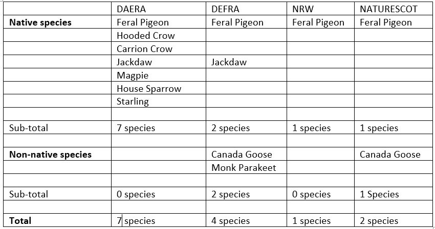 Here are three tables which set out the current position for the three different categories of general licence in each of the four UK nations.